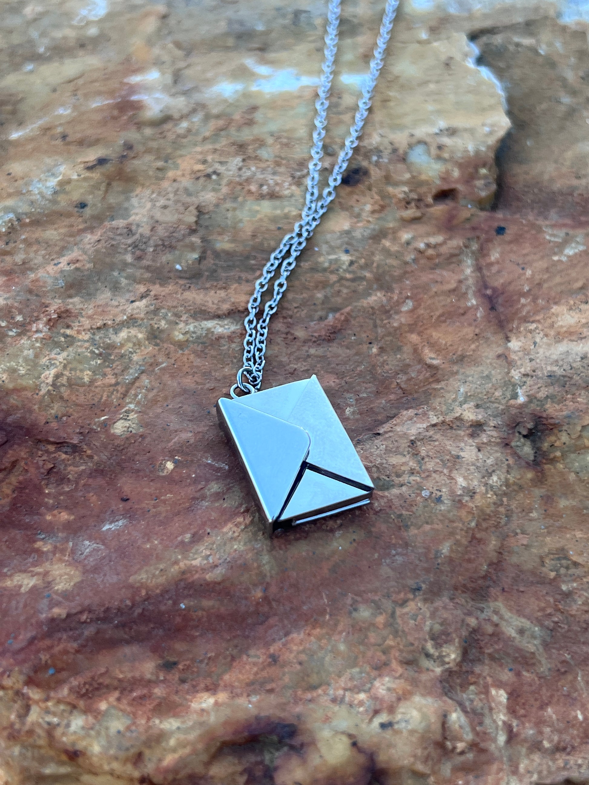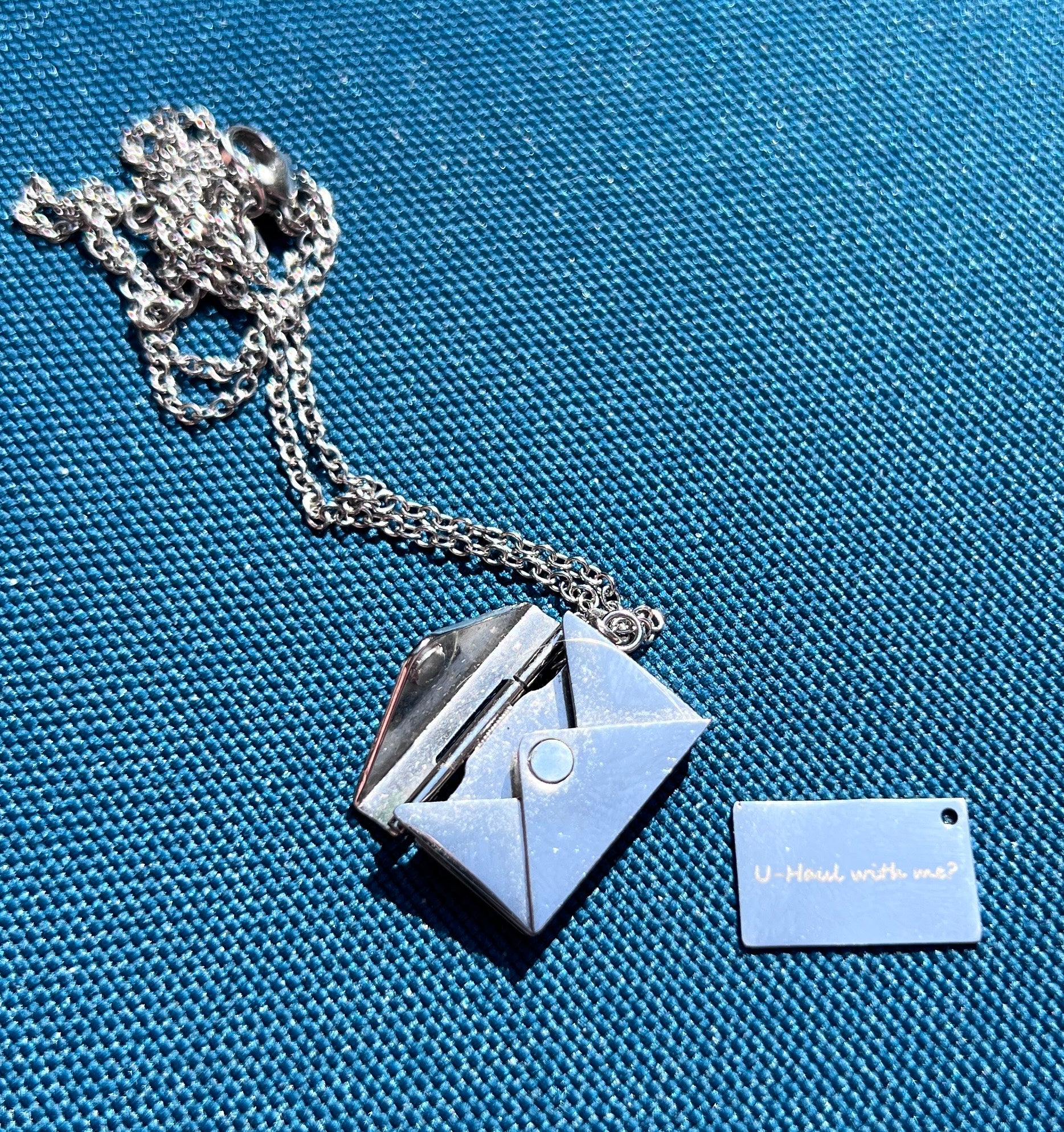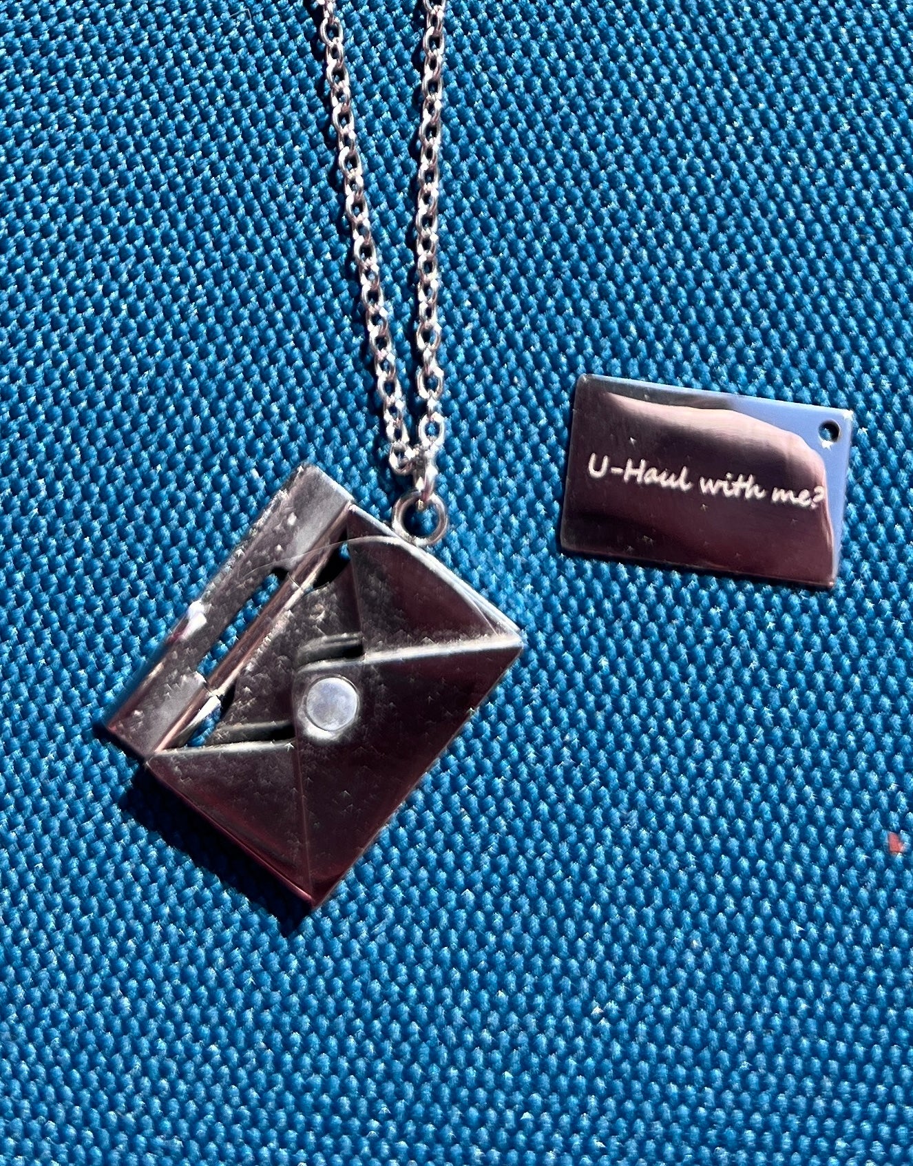 The charming love letter necklace was designed for the whimsical romantics. This necklace features a delicate envelope-shaped pendant, complete with a miniature letter nestled inside. The letter is inscribed with the playful message, "U-Haul with me?" This well known joke in the lesbian community captures the spirit of shared adventures and enduring love.