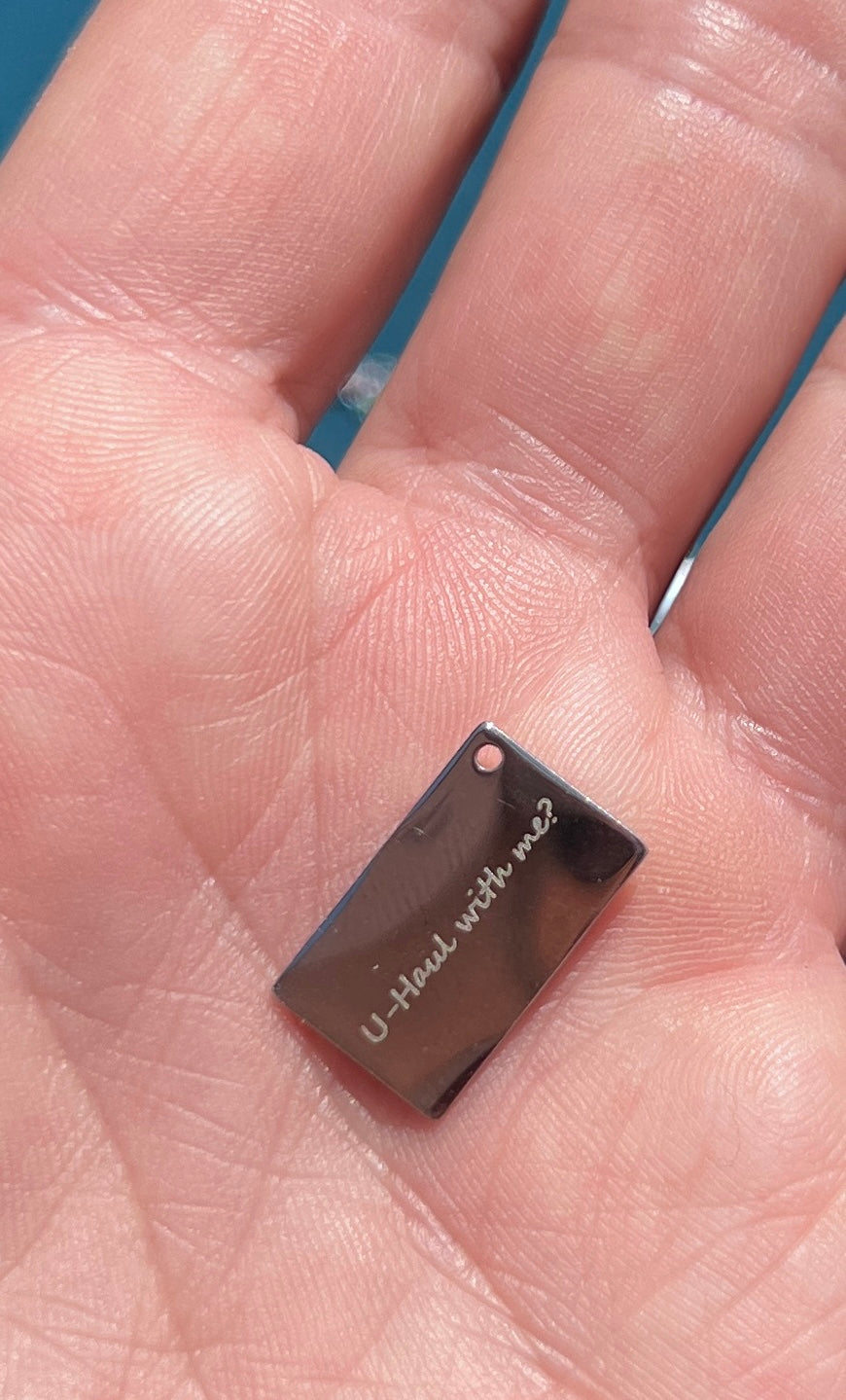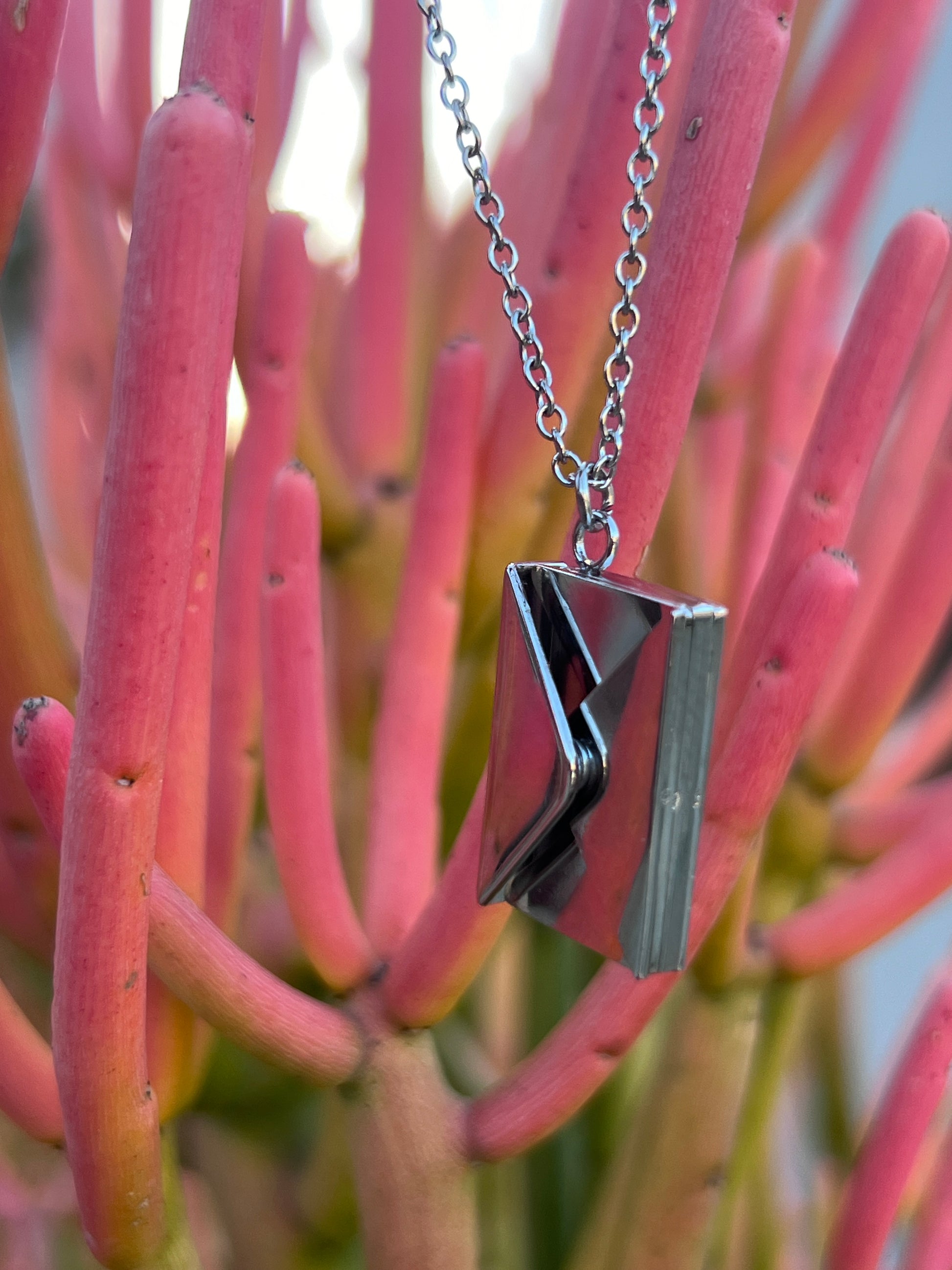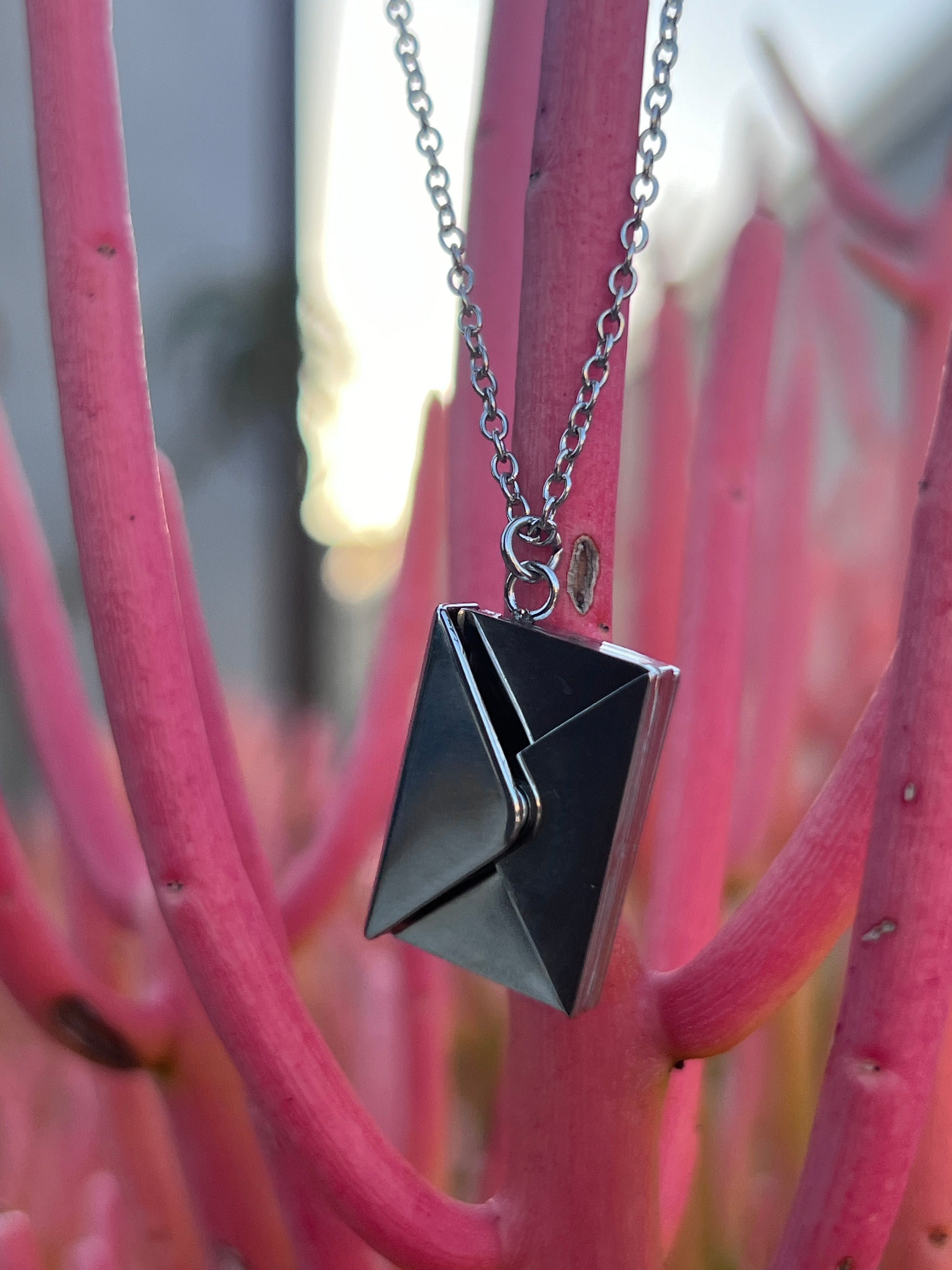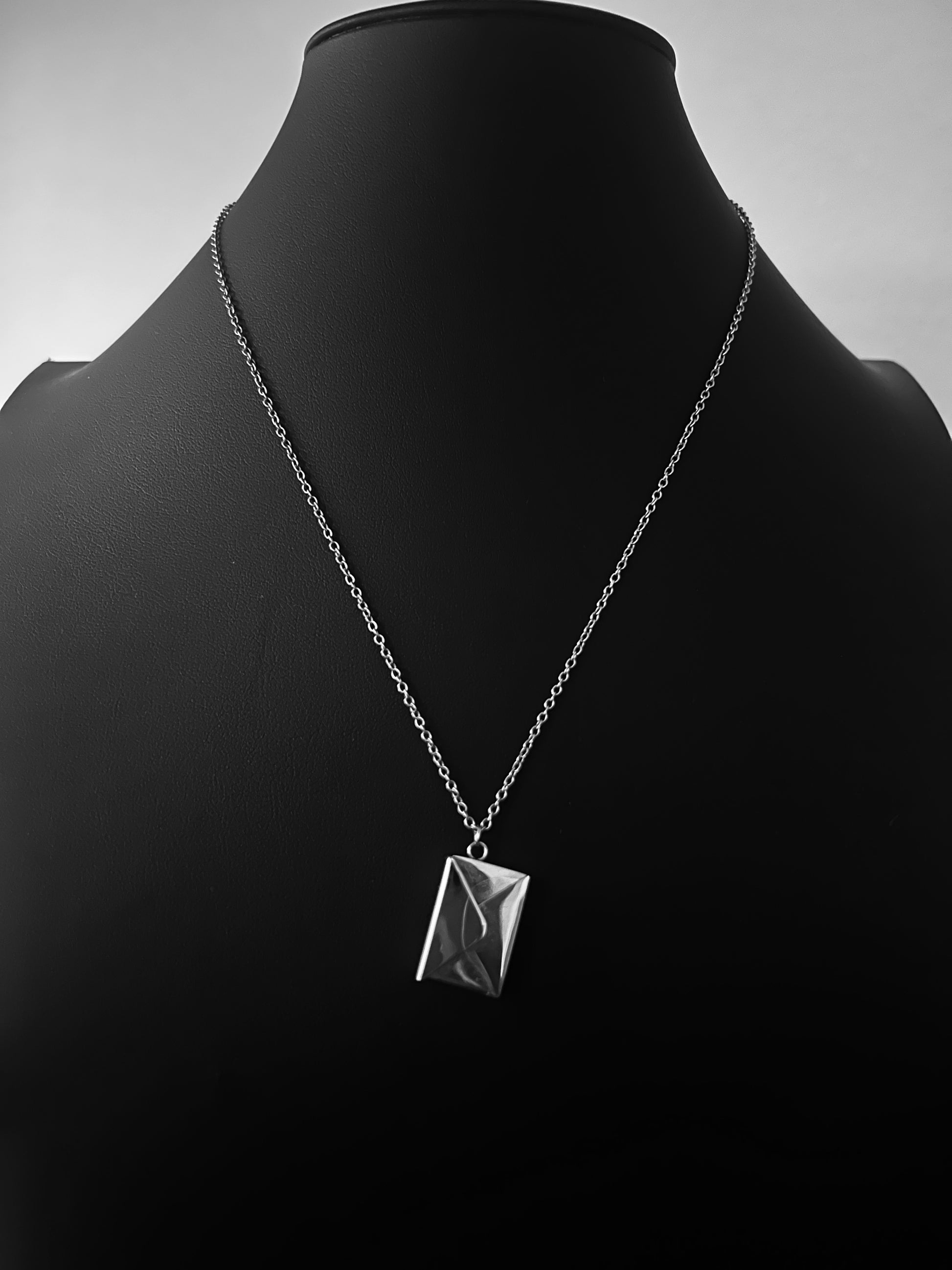 The charming love letter necklace was designed for the whimsical romantics. This necklace features a delicate envelope-shaped pendant, complete with a miniature letter nestled inside. The letter is inscribed with the playful message, "U-Haul with me?" This well known joke in the lesbian community captures the spirit of shared adventures and enduring love.
