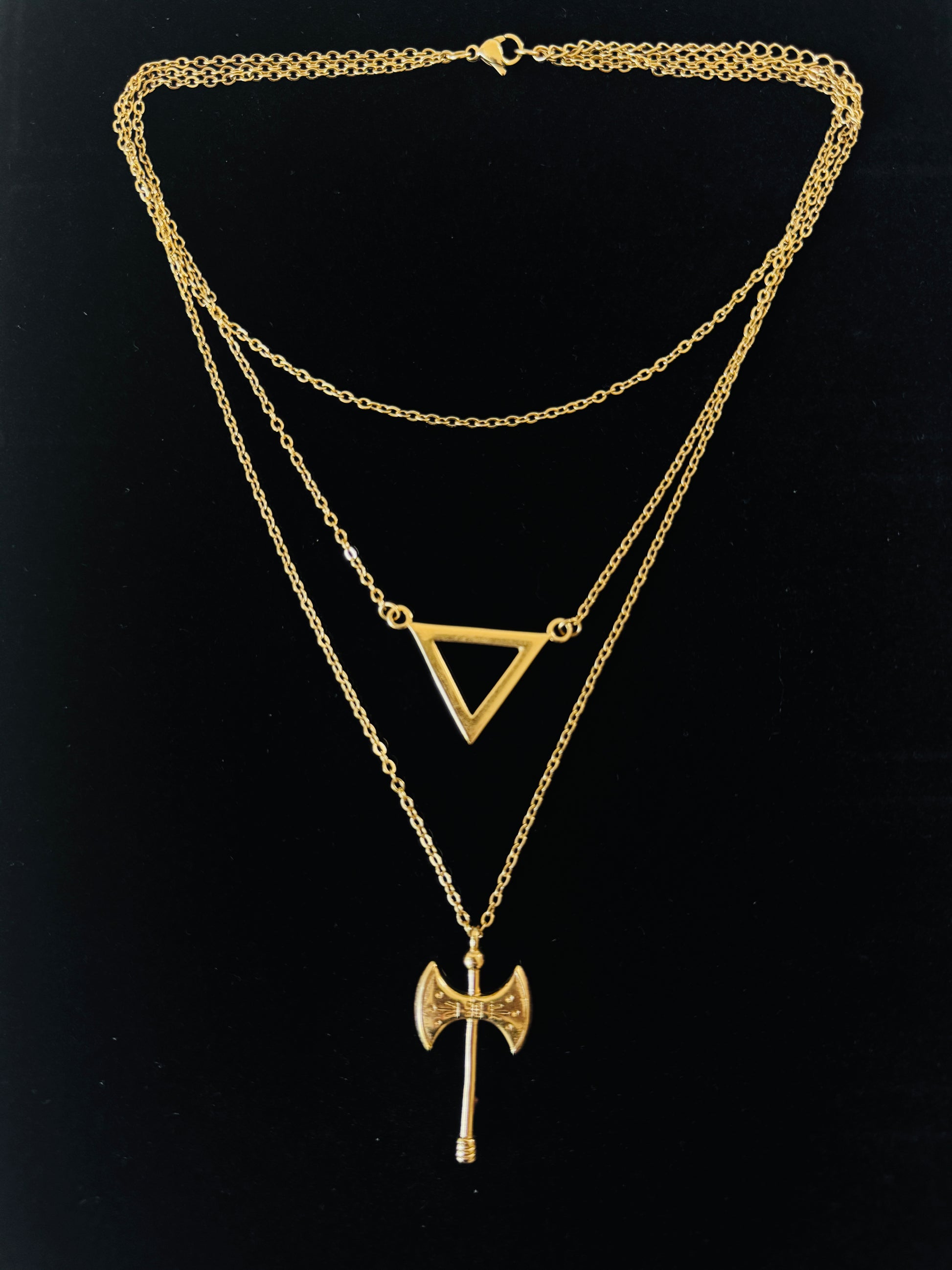 A statement in layers, this necklace carries the weight of sapphic history with modern edge. Three delicate chains, featuring the upside down triangle, a powerful reclaimed badge of gay resilience and the labrys, the double-headed axe of ancient goddesses and a powerful feminist and lesbian symbol of strength.